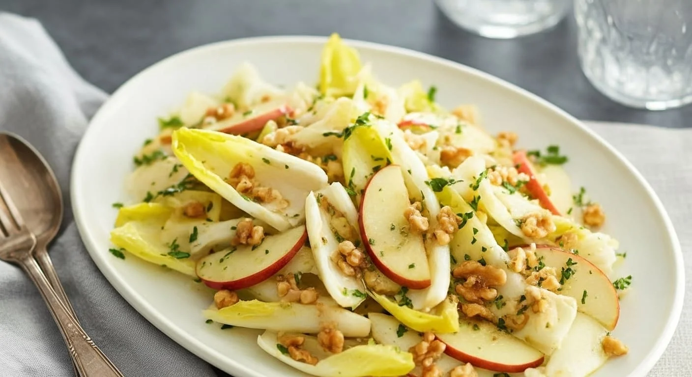 Les endives et les pommes sont finement tranchées, puis mélangées à des herbes fraîches et des noix grillées, le tout nappé d’une vinaigrette au citron.